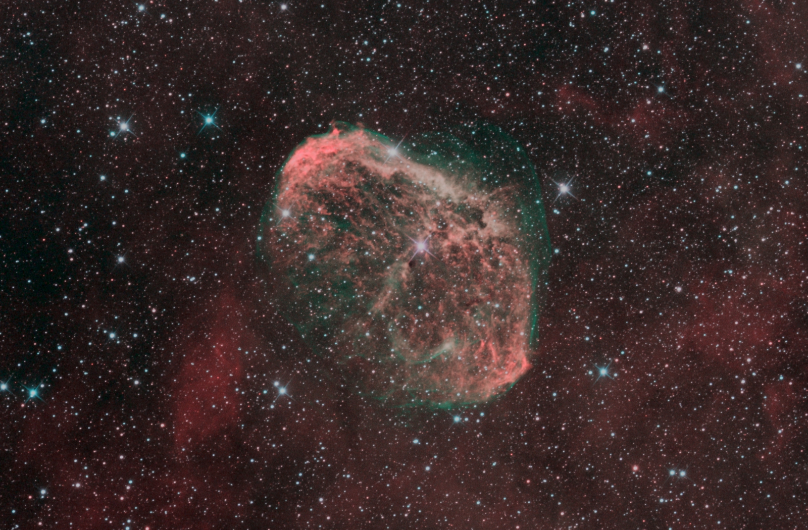 | 弓形構造やフィラメント状のガスが美しい輝線星雲で、形状から『三日月星雲』『Crescent Nebula』と呼ばれています。 |