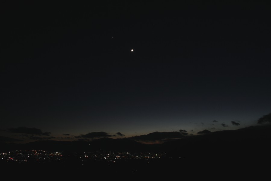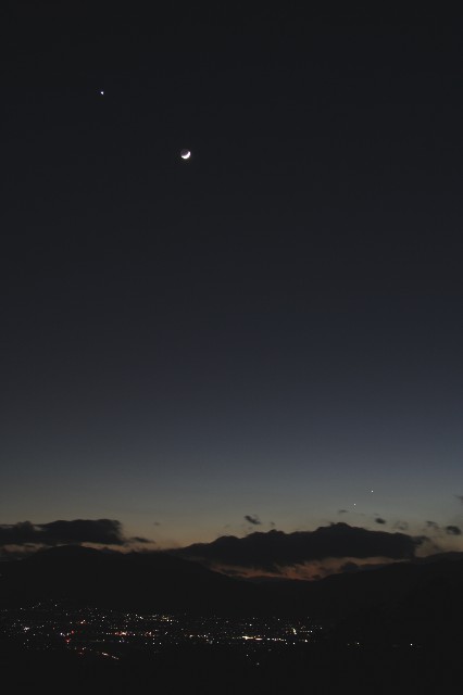上から金星、月、木星(右上)、水星(左下) 灯火は松本市